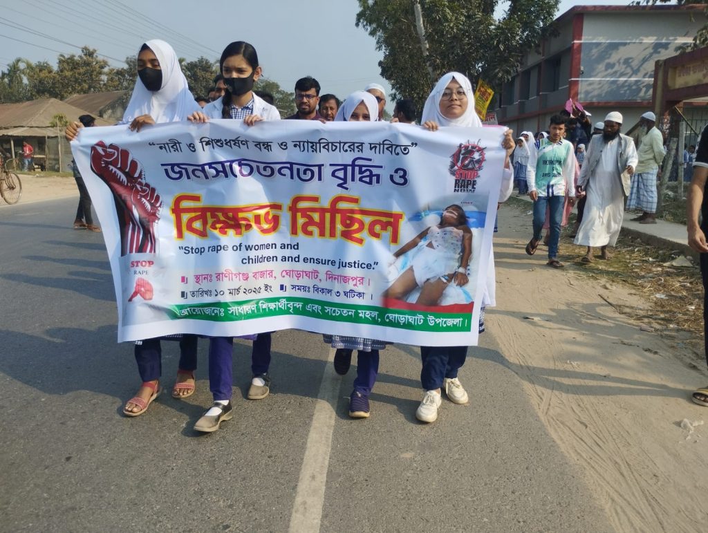 দেশব্যাপী সকল ধর্ষণের বিচার ও ধর্ষকদের সর্বোচ্চ শাস্তির দাবিতে দিনাজপুরের ঘোড়াঘাটে বিক্ষোভ মিছিল করেছে সাধারণ শিক্ষার্থীরা। সোমবার (১০ মার্চ) বিকাল ৩টায় উপজেলার রাণীগঞ্জ সরকারি স্কুল এন্ড কলেজের সামনে থেকে একটি বিক্ষোভ মিছিল বের করে শিক্ষার্থীরা। মিছিলটি দিনাজপুর-গোবিন্দগঞ্জ আঞ্চলিক মহা সড়ক প্রদক্ষিণ করে একই স্থানে এসে শেষ হয়। পরে সেখানে প্রতিবাদ সমাবেশ অনুষ্ঠিত। বক্তারা বলেন, দেশব্যাপী শুধু ধর্ষণ নয়, আইনশৃঙ্খলা পরিস্থিতির চরম অবনতি হয়েছে। এর আগেও ধর্ষণের ঘটনায় বিচারহীনতার অভাবে আসামিরা পার পেয়ে গেছে। যার কারণে একের পর এক এ ধরনের ঘটনা বেড়েই চলছে। অথচ নারীদের পোশাকের ওপর দোষারোপ করা হচ্ছে। দ্রুত আসামিদের গ্রেপ্তার করে বিচারের আওতায় আনা না হলে কঠোর কর্মসূচি দেওয়া হবে।