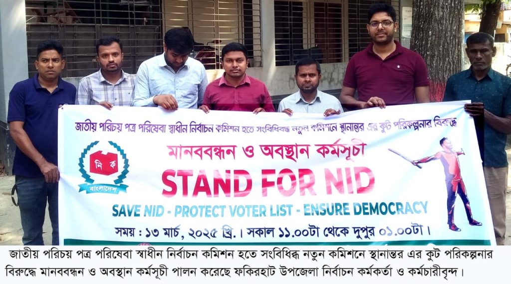 জাতীয় পরিচয় পত্র পরিষেবা স্বাধীন নির্বাচন কমিশন হতে সংবিধিব্ধ নতুন কমিশনে স্থানান্তর এর কুট পরিকল্পনার বিরুদ্ধে মানববন্ধন ও অবস্থান কর্মসূচী পালন করেছে ফকিরহাট উপজেলা নির্বাচন কর্মকর্তা ও কর্মচারীবৃন্দ।