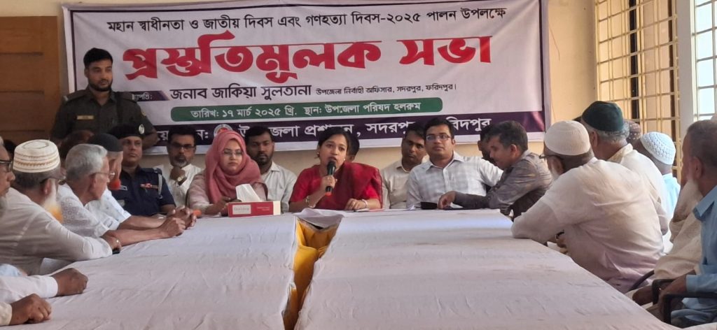 ফরিদপুরের সদরপুরে উপজেলা প্রশাসনের আয়োজনে মহান স্বাধীনতা ও জাতীয় দিবস এবং গণহত্যা দিবস-২০২৫ উপলক্ষ্যে প্রস্তুতিমূলক সভা অনুষ্ঠিত হয়েছে।