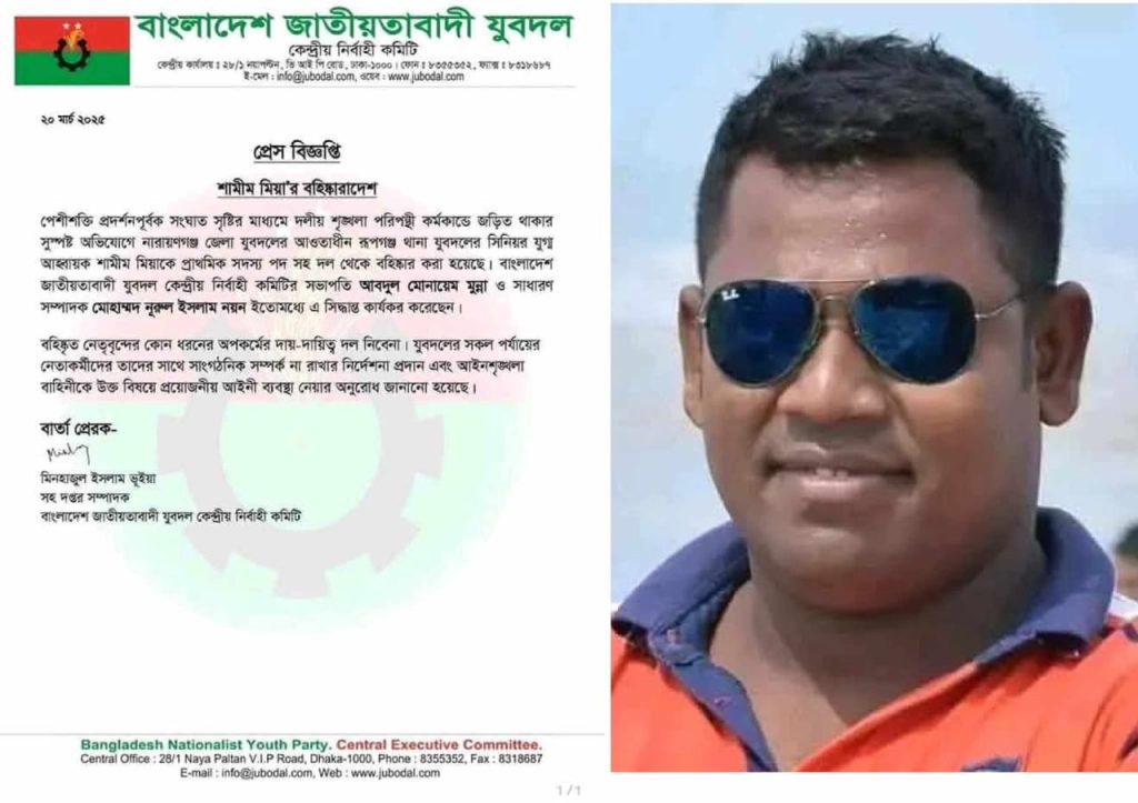 রূপগঞ্জের চনপাড়া পুনর্বাসন কেন্দ্র এলাকায় যুবদল ও স্বেচ্ছাসেবকদলের সমর্থিতদের সংঘর্ষে গুলিবিদ্ধ হাসিব নিহতের ঘটনায় জড়িত থাকার অভিযোগে গতকাল ২০মার্চ বৃহস্পতিবার রূপগঞ্জ উপজেলা যুবদলের সিনিয়র যুগ্ম আহবায়ক শামিম মিয়াকে দল থেকে বহিষ্কার করা হয়েছে। বাংলাদেশ জাতিয়তাবাদী যুবদল কেন্দ্রীয় নির্বাহী কমিটির সভাপতি আবদুল মোনায়েম মুন্না ও সাধারণ সম্পাদক নুরুল ইসলাম নয়ন এ সিদ্ধান্ত কার্যকর করেন। পেশীশক্তি প্রদর্শন পূর্বক সংঘাত সৃষ্টির মাধ্যমে দলীয় শৃঙ্খলা পরিপন্থী কর্মকান্ডে জড়িত থাকার সুস্পষ্ট অভিযোগে এ সিদ্ধান্ত গ্রহণ করা হয়। বাংলাদেশ জাতিয়তাবাদী যুবদল কেন্দ্রীয় নির্বাহী কমিটির সহ দপ্তর সম্পাদক মিনহাজুল ইসলাম ভুঁইয়া বিষয়টি নিশ্চিত করেছেন।