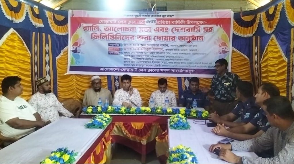 দিনাজপুরের ঘোড়াঘাট প্রেস ক্লাবের ৩৮ তম প্রতিষ্ঠা বার্ষিকী উপলক্ষে র্যালি, আলোচনা সভা এবং দেশবাসিসহ ফিলিস্তিনিদের জন্য দোয়া অনুষ্ঠান অনুষ্ঠিত হয়।