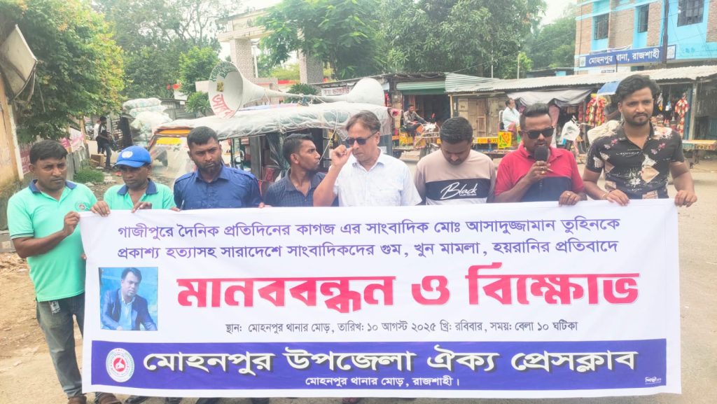রাজশাহীর মোহনপুরে সাংবাদিক তুহিন হত্যার প্রতিবাদে বিক্ষোভ ও মানববন্ধন অনুষ্ঠিত হয়
