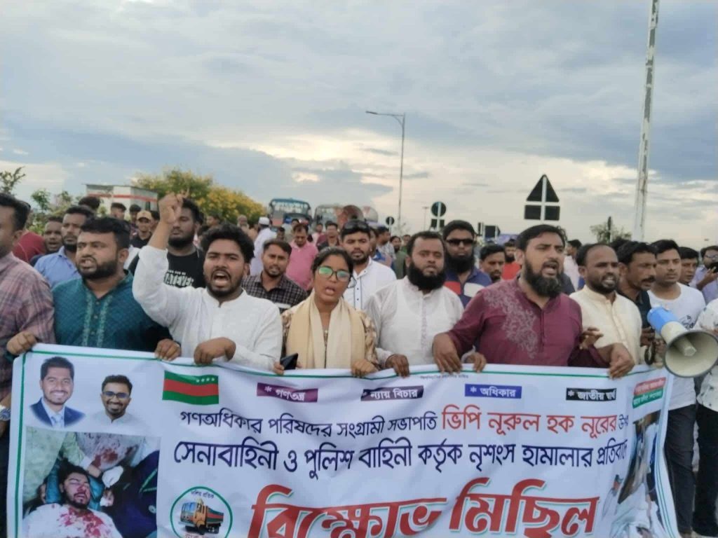 গণঅধিকার পরিষদের কেন্দ্রীয় সভাপতি ভিপি নুরুল হক নুর ও অর্ধ শতাধিক নেতাকর্মীদের উপর সেনাবাহিনী ও পুলিশের হামলার প্রতিবাদে ফরিদপুরের ভাঙ্গায় বিক্ষোভ মিছিল অনুষ্ঠিত হয়েছে।
