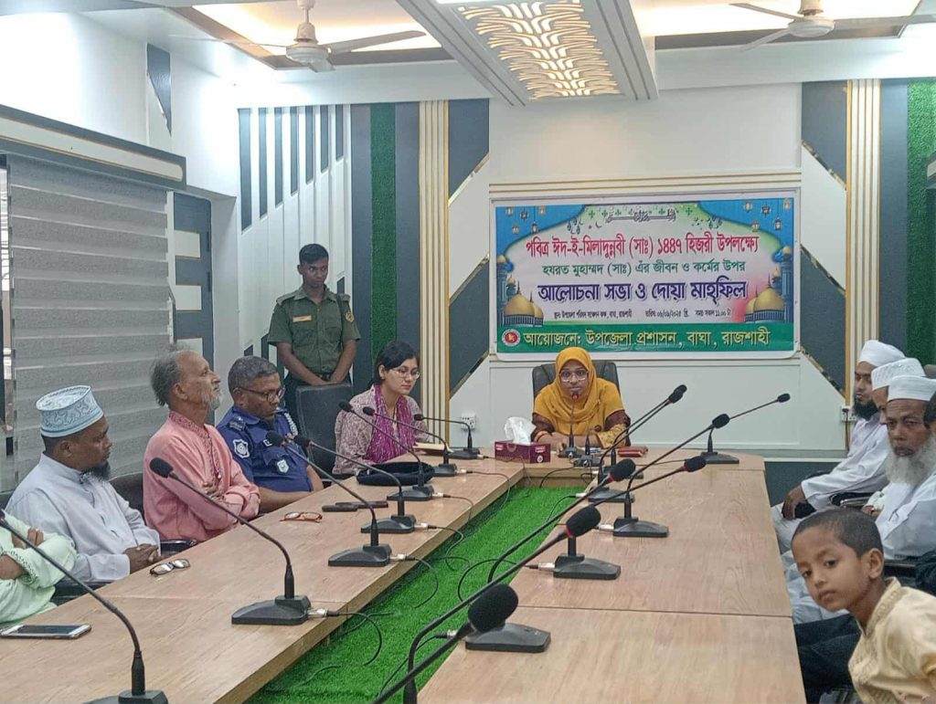 পবিত্র ঈদে মিলাদুন্নবী (সাঃ) ১৪৪৭ হিজরী উপলক্ষে বাঘা উপজেলা প্রশাসনের উদ্যোগে হযরত মুহাম্মদ (সাঃ)-এর জীবন ও কর্মের ওপর আলোচনা সভা ও দোয়া মাহফিল অনুষ্ঠিত হয়েছে। শনিবার সকালে উপজেলা পরিষদ মিলনায়তনে এ অনুষ্ঠান আয়োজন করা হয়। আলোচনা সভার সঞ্চালনা করেন উপজেলা সহকারী কমিশনার (ভূমি) সাবিহা সুলতানা ডলি। অনুষ্ঠানে প্রধান অতিথি ছিলেন, উপজেলা নির্বাহী কর্মকর্তা শাম্মী আক্তার। বিশেষ বক্তা হিসেবে আলোচনা করেন বাঘা উপজেলা মডেল মসজিদের পেশ ইমাম মাওলানা আবুল কালাম আজাদ ও বাঘা ফাজিল মাদরাসার প্রভাষক ইব্রাহিম খলিল। এছাড়া বক্তব্য রাখেন বাঘা প্রেসক্লাবের আহ্বায়ক আব্দুল লতিফ এবং বাঘা ফাজিল মাদরাসার প্রভাষক হাফেজ ক্বারী ইন্তাজ আলী। আলোচকরা তাঁদের বক্তব্যে হযরত মুহাম্মদ (সাঃ)-এর জীবনাদর্শ ও কর্মমুখী দিকগুলো তুলে ধরে সমাজে শান্তি, সাম্য ও মানবকল্যাণে তাঁর অবদানের কথা স্মরণ করেন। শেষে দেশ ও জাতির সমৃদ্ধি কামনায় বিশেষ দোয়া অনুষ্ঠিত হয়।