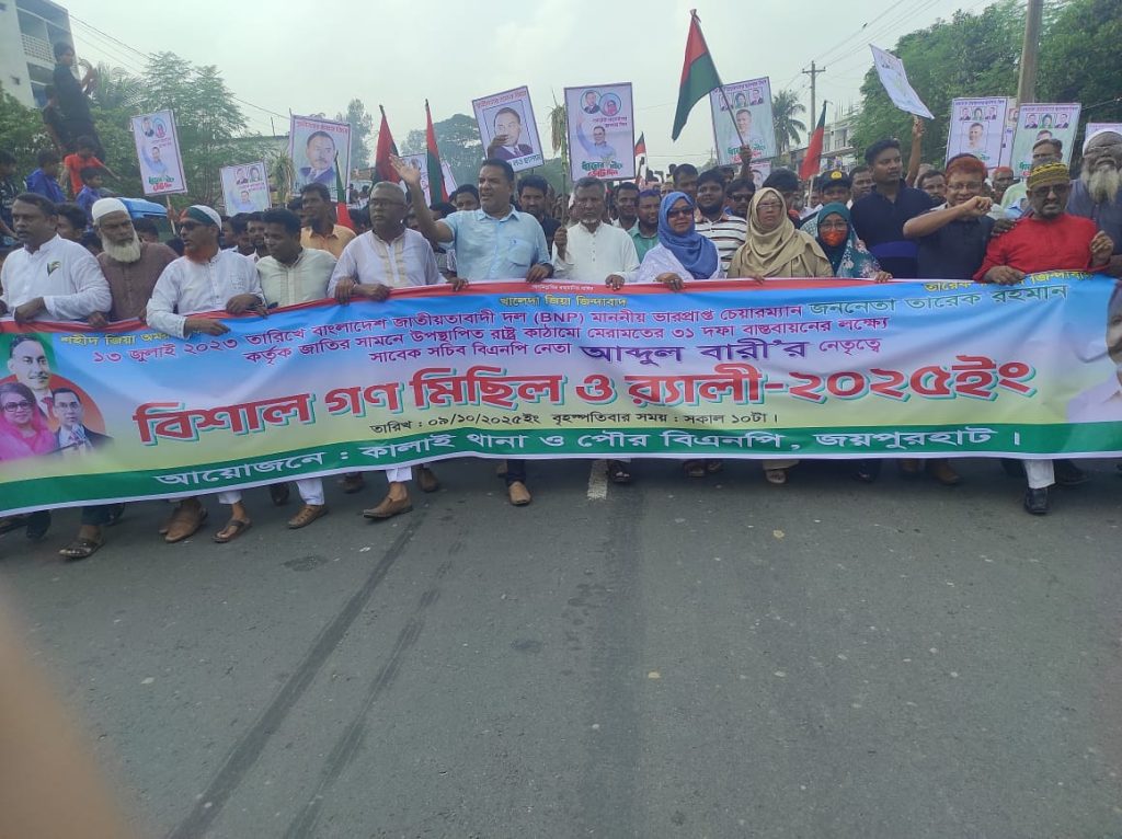 (বিএনপি)-এর ভারপ্রাপ্ত চেয়ারম্যান ঘোষিত রাষ্ট্র কাঠামো মেরামতের ৩১ দফা বাস্তবায়নের লক্ষ্যে জয়পুরহাটের কালাইয়ে অনুষ্ঠিত হয়েছে এক বিশাল জনসভা ও মিছিল। বৃহস্পতিবার (৯ অক্টোবর ২০২৫) সকাল ১০টায় কালাই সরকারি মহিলা কলেজ মাঠে এ জনসভা ও র‌্যালির আয়োজন করে কালাই থানা ও পৌর বিএনপি।