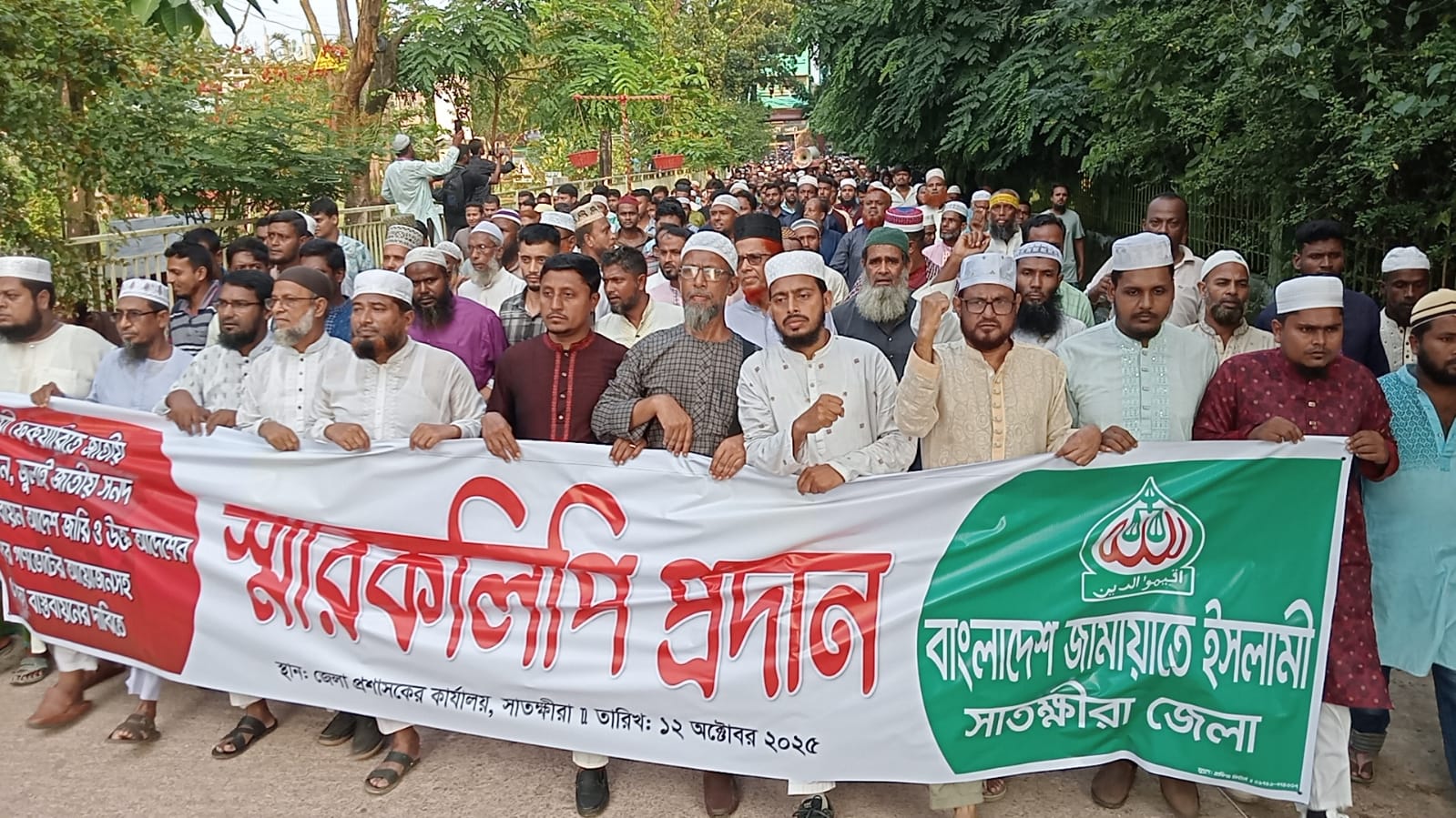 রোববার (১২ অক্টোবর) বিকাল সাড়ে ৪টায় শহরের খুলনা রোড মোড়স্থ আসিফ চত্ত্বর এলাকা ও শহীদ আব্দুর রাজ্জাকা পার্ক থেকে পৃথক বিক্ষোভ মিছিল নিয়ে হাজার হাজার নেতাকর্মী সহ জামায়াত নেতৃবৃন্দ জেলা প্রশাসক জনাব মোস্তাক আহমেদের মাধ্যমে প্রধান উপদেষ্টার কাছে স্মারকলিপি প্রদান করেন। এসময় উপস্থিত ছিলেন,জামায়াতে ইসলামীর কেন্দ্রীয় সাংগঠনিক সেক্রেটারী মুহাদ্দিস আব্দুল খালেক, সাতক্ষীরা জামায়াতের আমীর উপাধ্যক্ষ শহিদুল ইসলাম মুকুল, জেলা নায়েবে আমীর ডা.মাহামুদুল হক, জেলা সেক্রেটারী মাওলানা আজিজুর রহমান, সহকারী সেক্রেটারী অধ্যাপক ওমর ফারুক, সহকারী সেক্রেটারী অধ্যাপক ওবায়দুল্লাহ, জেলা কর্মপরিষদ সদস্য এড.আব্দুস সুবহান মুকুল, শহর আমীর জাহিদুল ইসলাম, সেক্রেটারী খোরশেদ আলম, সদর উপজেলা নায়েবে আমীর আলহাজ্ব মাস্টার হাবিবুর রহমান, সদর সেক্রেটারী হাবিবুর রহমান,দেবহাটা সেক্রেটারী ইমদাদুল হক প্রমুখ।