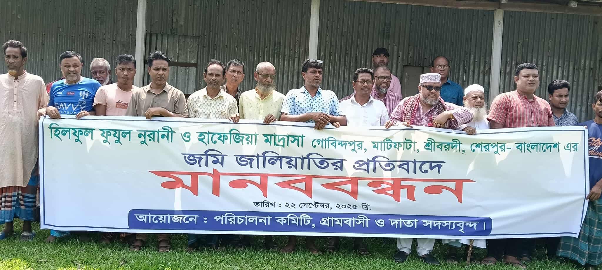 শেরপুরে হিলফুল ফুজুল নূরানী ও হাফেজিয়া মাদরাসায় অনিয়মের অভিযোগে মানববন্ধন